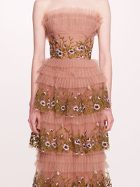 Step into enchanting elegance with the Tiered Terrarium Column Gown, featuring a strapless design adorned with intricate terrarium embroidery on delicate tulle. The ethereal tulle pleated neckline adds a whimsical touch, while the tiered silhouette gracefully flows to create a captivating profile. Details Pictured in tan green 100% polyester Dry clean only Style ID: N76G3780