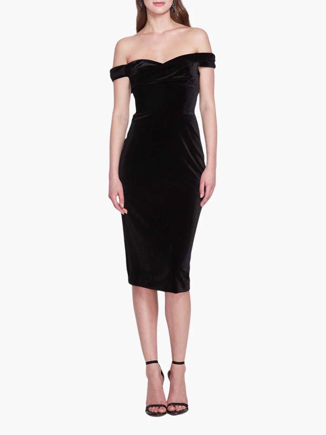 The definition of charm, this cocktail dress in black features an off-the-shoulder sweetheart neckline, asymmetrically draped bodice, and a velvet pegged skirt. Model is wearing size US 0. This item is Final Sale & will ship in 7–10 business days Sizing and Fit • Silhouettes are designed to fit true to size, following a classic American fit. • Clients familiar with European sizing may wish to consider sizing down for a closer fit. • Many styles are crafted from exquisite woven fabrics, often adorned with delicate embellishments, and are intended to maintain their structure without stretch unless otherwise specified. • For bespoke sizing guidance or personalized assistance, our concierge team is delighted to help at concierge@marchesafashion.com.
