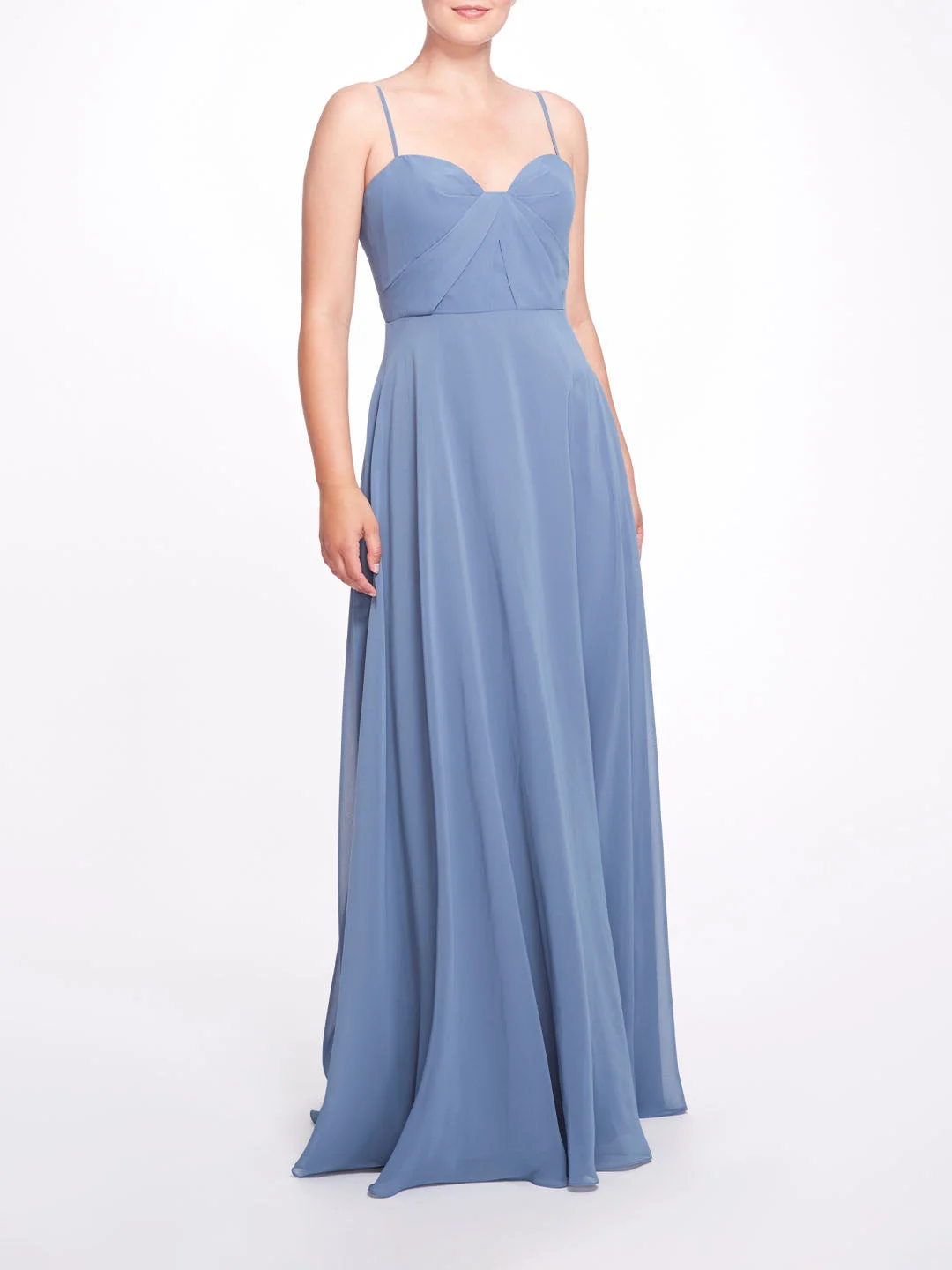 The Verona gown in slate blue is for the fairytale bridal party. The cami gown features a semi-sweetheart neckline, open back, and is finished with an elongated back tie detail. Details Pictured in Slate Blue Cami Straps Ribbon Detail 100% Polyester Dry Clean Imported Style ID: BM1147