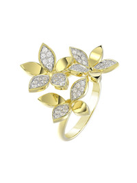 The Wild Flower Yellow Gold Ring features a yellow gold open band set with pave diamonds and complete with a trio of dynamic teardrop-shaped diamond and yellow gold flowers. Details Pictured in yellow gold 18KT 0.35 cts VS2/SI1 Style: MVR90011