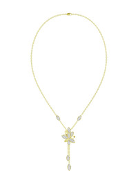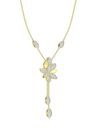 The Wild Flower Yellow Gold Y Necklace is an 18 karat yellow gold chain with a dynamic teardrop-shaped diamond and yellow gold flower at its center. The chain is adorned with almond-shaped natural diamond accents. Details Pictured in yellow gold 18KT 0.77 cts VS2/SI1 Style: MVN90008