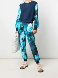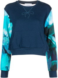 The Wilma Sweatshirt Printed is made of a super soft fleece jersey fabric, a crew rib neckline with embroidered bow detail, dropped shoulder, a blouse effect long sleeve with blouse effect and a relaxed cropped fit. The Marchesa signature painterly floral print mix in navy multi with solid accents and cool tones breathes life into this athleisure piece.