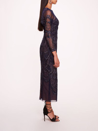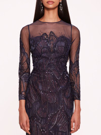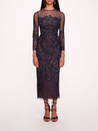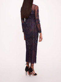 The Winged Symphony Midi Dress is crafted from winged-symphony degrade sequins, offering a mesmerizing blend of shimmer and depth. Featuring an illusion neckline and long sleeves, it strikes the perfect balance between elegance and modern allure, making it a standout choice for any special occasion.