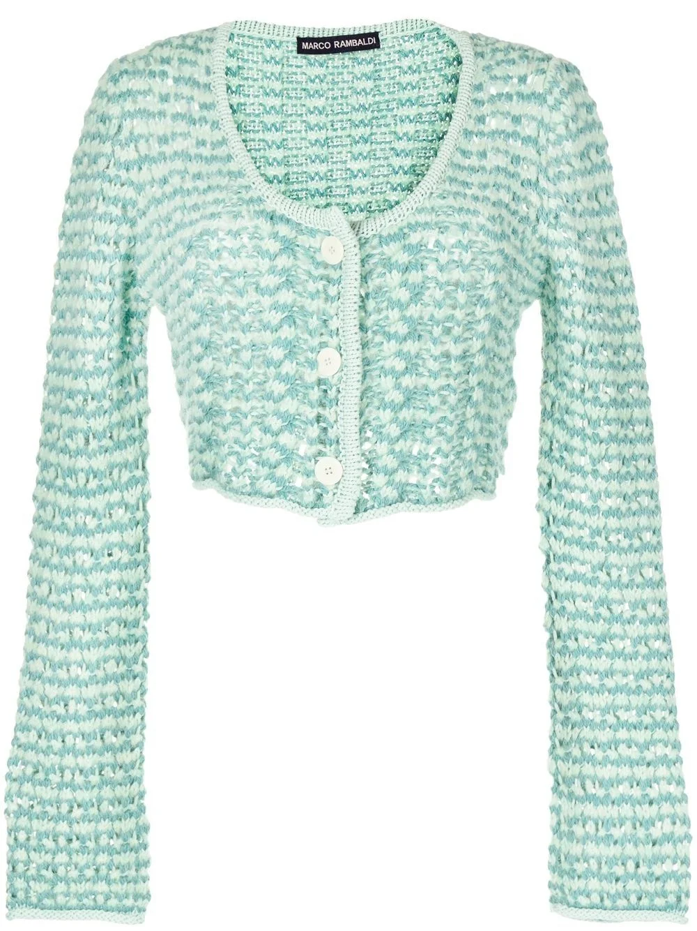 chunky-knit button-down cardigan light green merino-wool-cotton-alpaca blend chunky knit V-neck front button fastening long sleeves Made in Italy Composition Acrylic 30%, Wool 24%, Cotton 23%, Alpaca 10%, Polyamide 8%, Merino 5% SIZE & FIT Model measurements Height 5 ft 11 in(1.8 m) Bust/Chest 28.34 in(72 cm) Hips 35.43 in(90 cm) Waist 23.62 in(60 cm) FittingInformation This piece fits true to size. We recommend you get your regular size Designed to be fitted at the waist and hips, loose over the leg Made with a mid-weight fabric Washing instructions Hand Wash