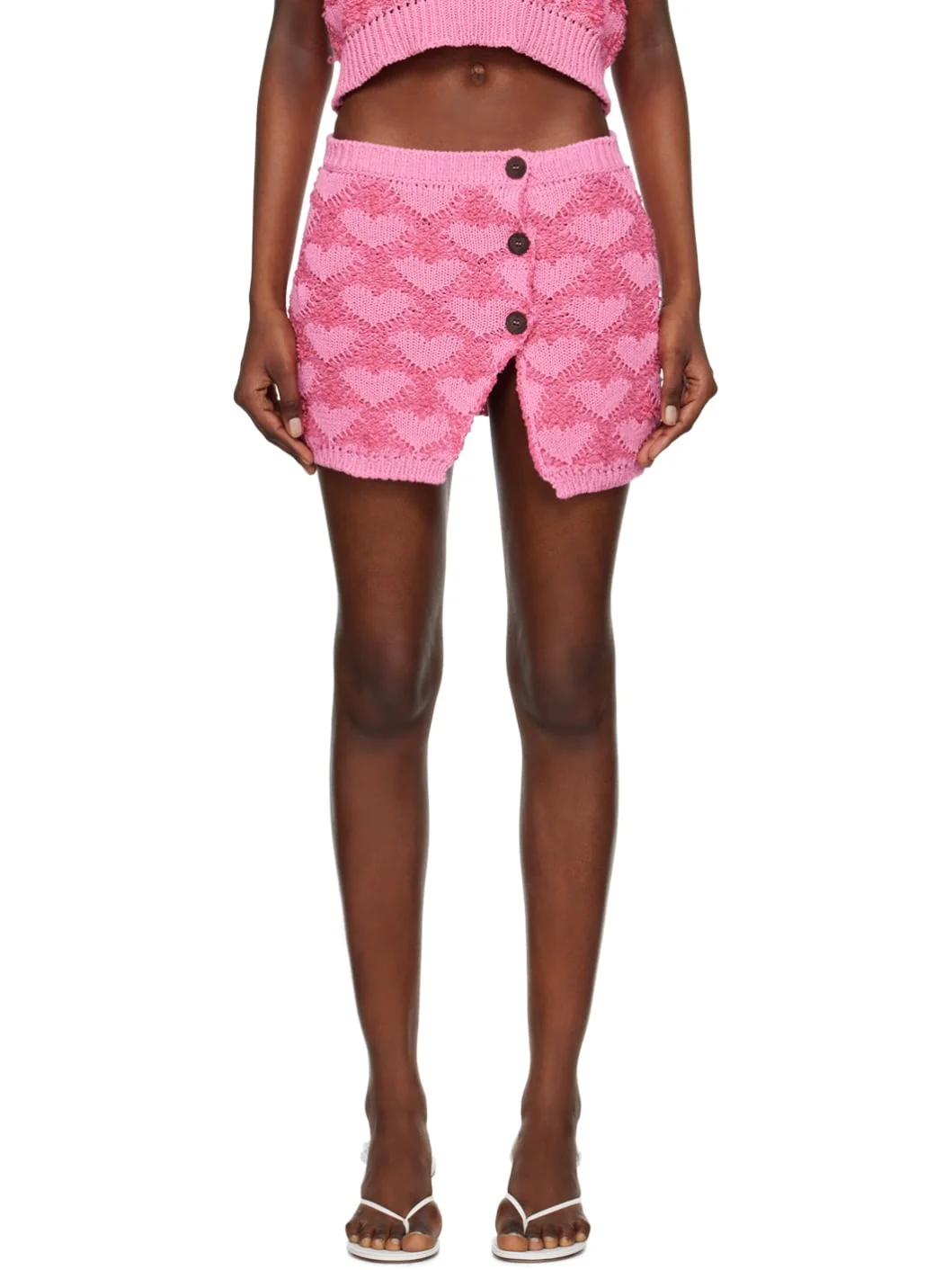 Knit cotton- and linen-blend skirt. Jacquard boucle pattern throughout. · Rib knit waistband and hem · Offset button closure · Vent at front hem Supplier color: Fuchsia/Pink 50% cotton, 25% linen, 18% polyester, 7% polyamide. Made in Italy 231761F090006
