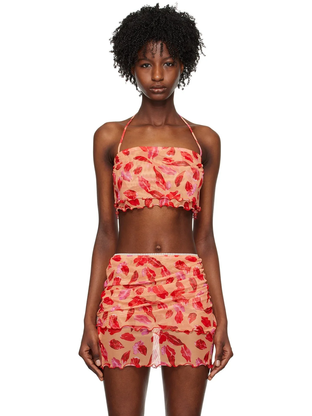 Stretch nylon mesh camisole. Graphic pattern printed throughout. · Square neck · Lettuce edge at tiered cropped hem · Self-tie halter strap · Fully lined Supplier color: Mouth 94% polyamide, 6% elastane. Made in Italy 231761F055001