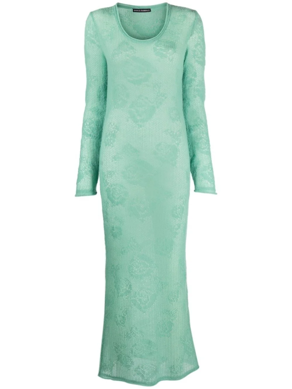 rose-applique knitted maxi dress aqua green mohair-merino wool blend knitted construction open knit floral applique high neck long sleeves straight hem long length Made in Italy Composition Mohair 50%, Nylon 36%, Merino 14% Washing instructions Dry Clean Only