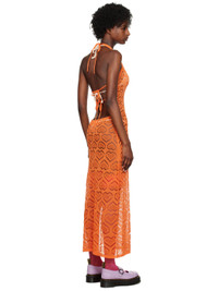 Semi-sheer raschel knit viscose-blend dress. Graphic pattern throughout. · Rib knit scoop neck and hem · Vented side seam · Self-tie halter strap · Self-tie fastenings at open back Available exclusively at SSENSE. Supplier color: Orange 88% viscose, 12% polyamide. Made in Italy 231761F055006