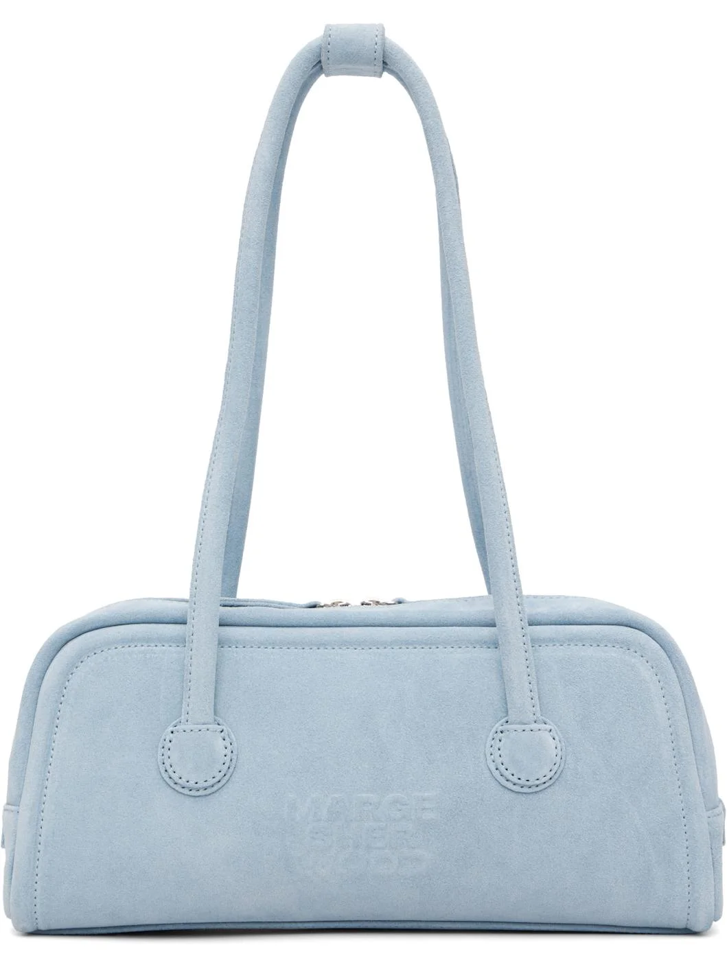 Suede shoulder bag. · Rolled shoulder straps with press-stud tab · Logo embossed at face · Zip closure · Zip and patch pockets at interior · Logo-woven twill lining · H6" x W11.5" x D3" Supplier color: Blue Suede Leather. Made in South Korea 261369F048032