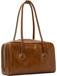 Crinkled leather top handle bag. · Press-stud tab at rolled shoulder straps · Logo embossed at face · Two-way zip closure · Patch and zip pocket at interior · Twill lining · Contrast stitching in off-white · H8" x W13" x D4.5" Supplier color: Brown crinkle Leather. Made in South Korea 261369F046014