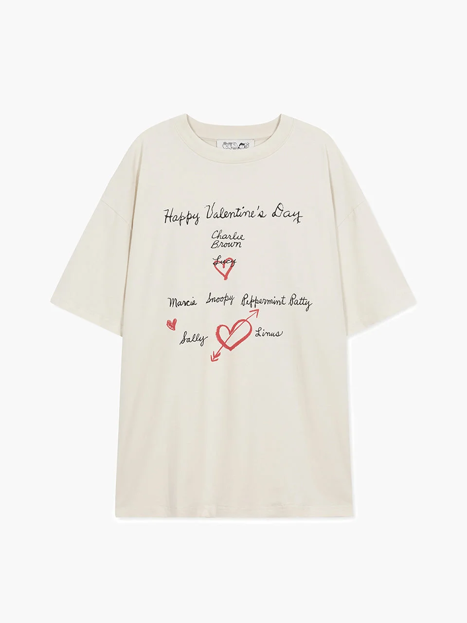 300051743OWT-01 / E6MW268-TS01-IV/00/IVORY - Oversized relaxed fit - Round crew neckline - Short sleeves - Peanuts character graphics - Valentine's Day themed text print - Soft cotton construction - Heart motif details MARGESHERWOOD Happy Valentine's Day Oversize Tee delivers playful romance with contemporary streetwear appeal. Crafted from soft cotton in cream with charming Peanuts character graphics and handwritten Valentine's messages throughout. The relaxed oversized silhouette and whimsical design create a perfect statement piece for casual styling.