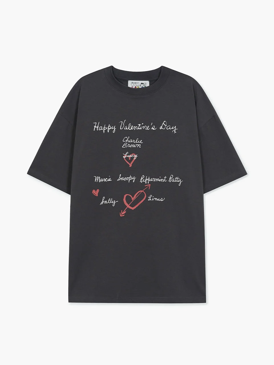 600083184CHA001 / MW268-TS01-CH/00/CHARCOAL - Oversized relaxed fit - Round neckline - Short sleeves - Valentine's Day themed graphics - Hand-drawn heart motifs - Script text detailing - Soft cotton jersey construction - Ribbed collar trim MARGESHERWOOD Happy Valentine's Day T-Shirt delivers playful romantic charm with contemporary streetwear appeal. Crafted from soft cotton jersey in charcoal gray, featuring whimsical script text and hand-drawn heart graphics with Peanuts character names. The oversized fit and vintage-inspired Valentine's theme create a unique statement piece perfect for casual styling.