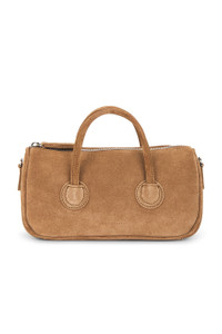 - Suede exterior with textile lining - Top zipper closure - One main compartment - Dual integrated handles - Detachable shoulder strap - Measures approx 9" W x 5" H x 2" D Shoulder strap with a 9" drop Top handle with a 1.75" drop - Revolve Style No. MGES-WY14 - Manufacturer Style No. FF047747
