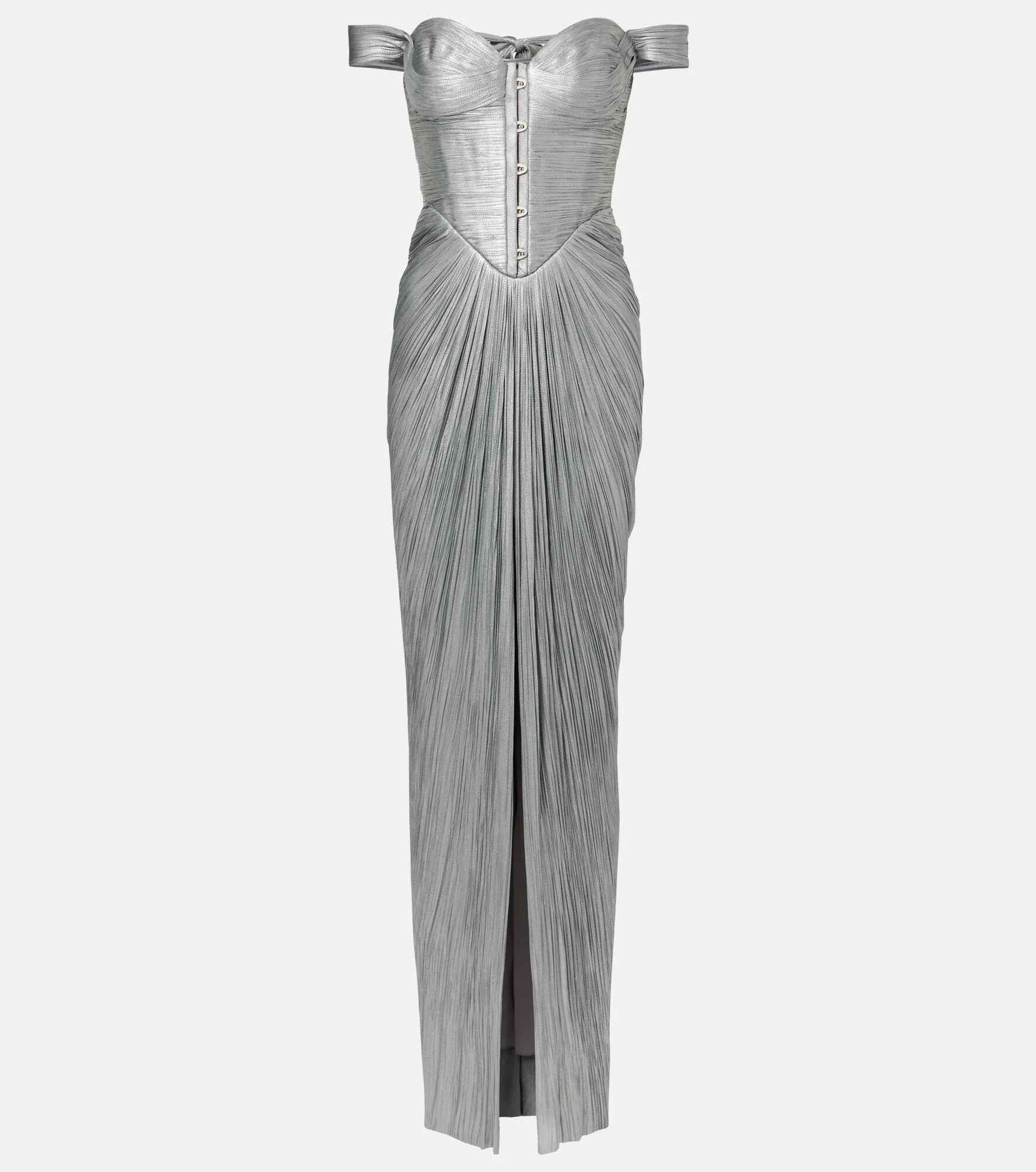Maria Lucia Hohan is the ultimate destination for red carpet-worthy looks. The Susie gown is crafted from metallic silk tulle into a statement silhouette with a bustier bodice, off-shoulder neckline, and gathered, form-fitting skirt. Product Details - Material: 100% silk - Care instructions: dry clean - Made in Romania - Color: silver - Designer color name: Ice Blue - Lining: 92% polyester, 8% elastane - Built-in bustier - Underwired cups - Padded cups - Self-tie back - Closure: concealed zipped back - Includes: garment bag - Item number: P01131918 Size & Fit - True to size - Off-the-shoulder - Internal corset with underwire support - Fitted - The model seen in the picture is 178cm-5'10" and wearing a size FR 34