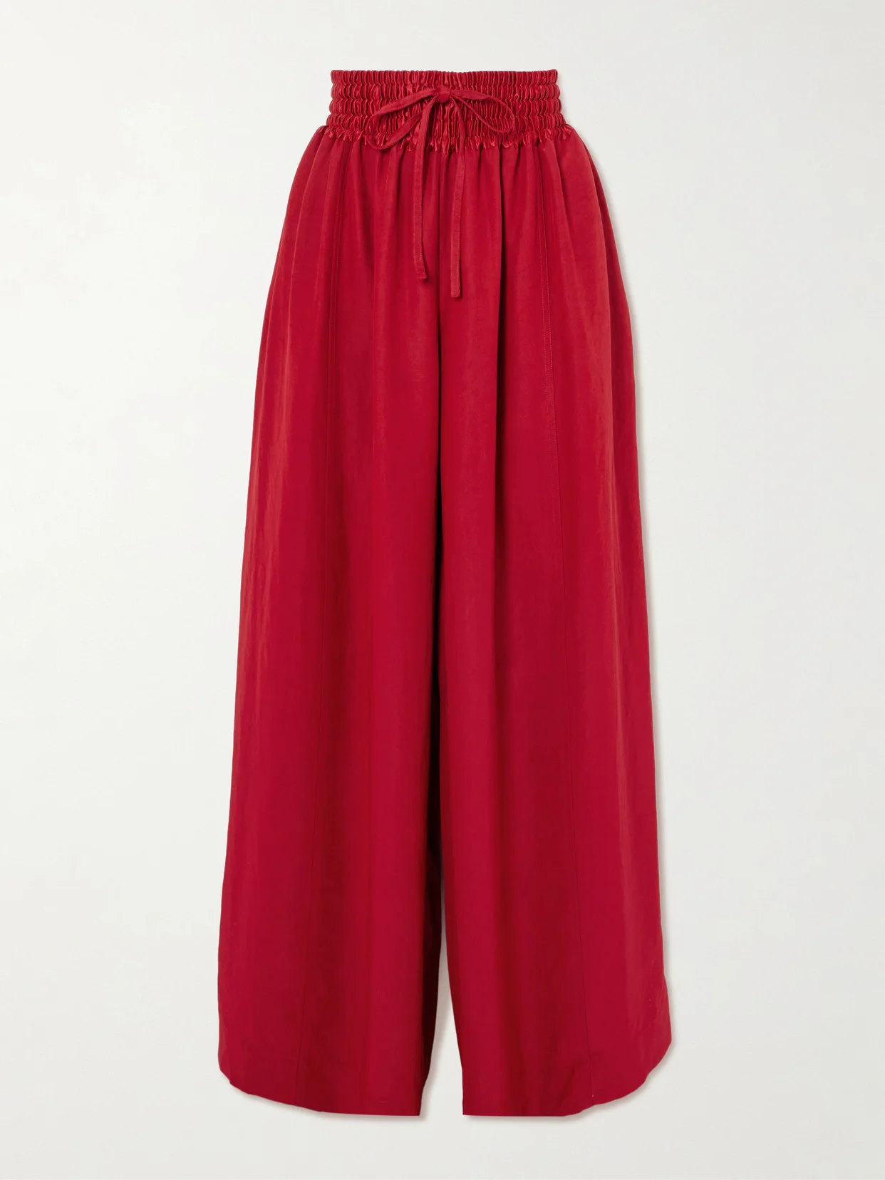 Maria McManus combines comfort with elegance in her designs and these 'Basketball' pants are the perfect example. They're made from satin and cotton-twill in a vibrant scarlet hue and fall to fluid, wide legs. The ruched waistband lends a textural contrast.