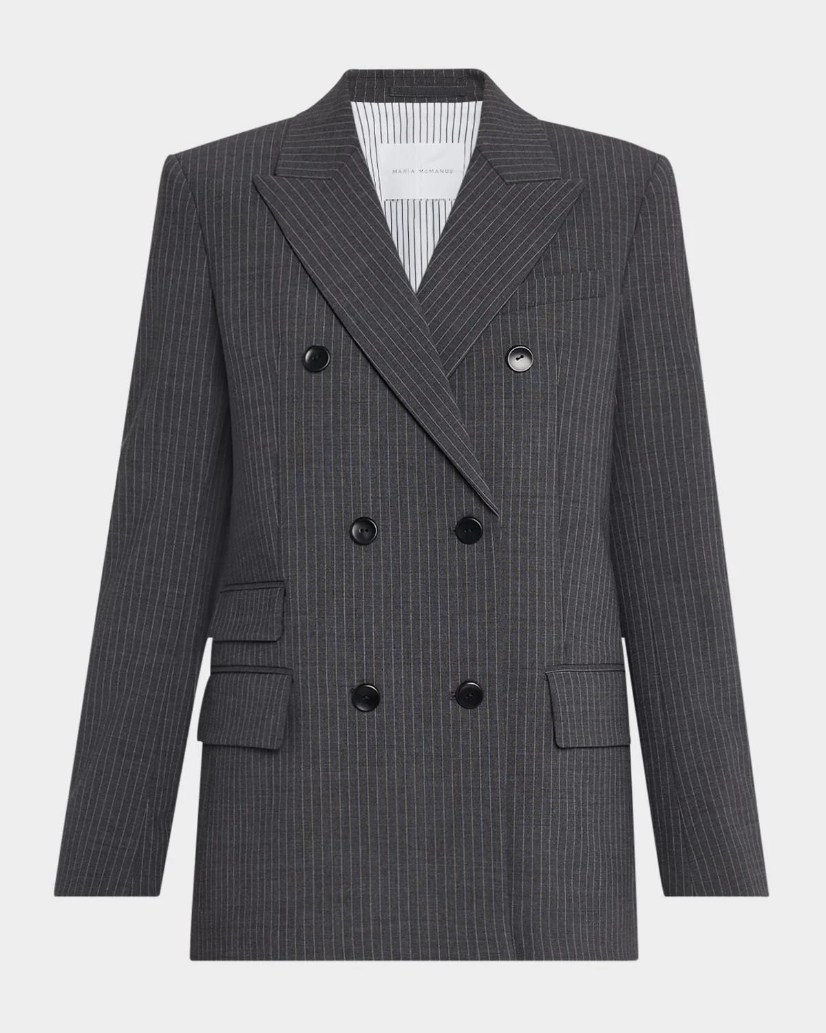 - MARIA MCMANUS "Billiet" blazer jacket with pinstripes - Peak lapels; double-breasted front - Long sleeves; button cuffs - Padded shoulders - Chest welt pocket - Hip flap pockets - Straight fit - Double-vented back - Wool/elastane - Made in USA