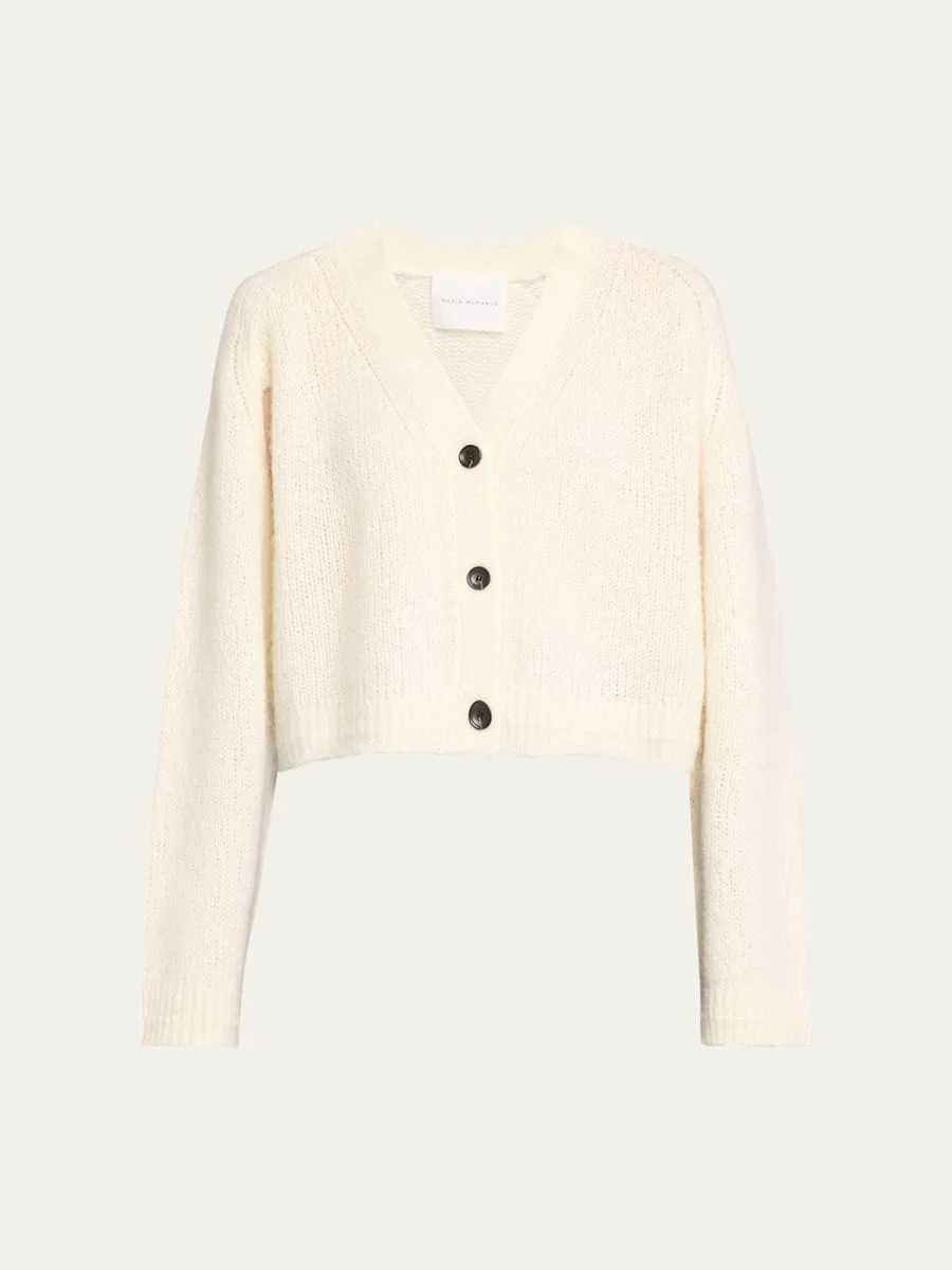 MARIA MCMANUS cradle-to-cradle cashmere cardigan featuring sleeve slit details creating the signature cape sleeves V neckline; button front Long ralgan sleeves Loose fit Ribbed cuffs and hem Cropped length Cashmere Unlined Imported Model is 5'10"/177cm. Online Inquiries: BGS21_B9G5Y| Store Inquiries: #4866627