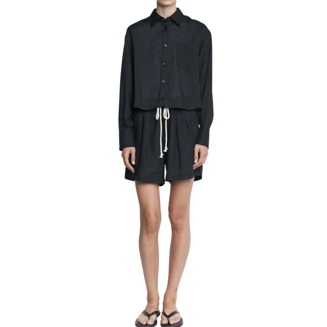The Cropped Shirt in black organic linen is a best-selling, relaxed fit, shirt. This cropped silhouette, has inverted box pleats for a gentle cocoon-like silhouette at the back, double needle stitch details at the cuff, and is finished with signature shell buttons and tonal MM monogram. - Black - Cropped long sleeve shirt - 100% GOTS Organic Cotton linen