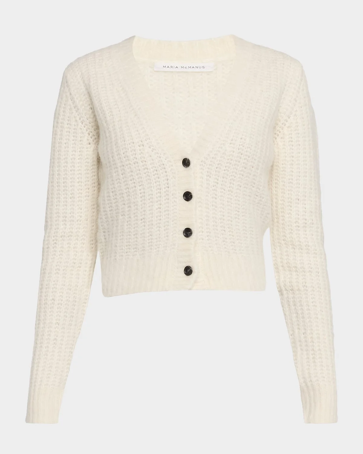 MARIA MCMANUS ultra-soft wool-blend cardigan finished with a waffeled texture V neckline Long sleeves Cropped fit Button-front & nbsp; Wool/merino wool/nylon/polyamide Dry clean or hand wash Imported SIZE & FITModel measurements: 5 & apos;10" tallModel is wearing a US size 4/Small