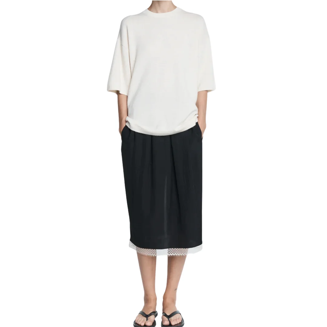 Knit from a luxe Italian recycled cashmere and organic cotton blend, the Drop Shoulder T-shirt in ivory has a relaxed, oversized fit and a beautiful lingerie stitch detail down the center back. - Ivory - Drop shoulder t-shirt - 69% Recycled Cashmere 31% GOTS Cotton