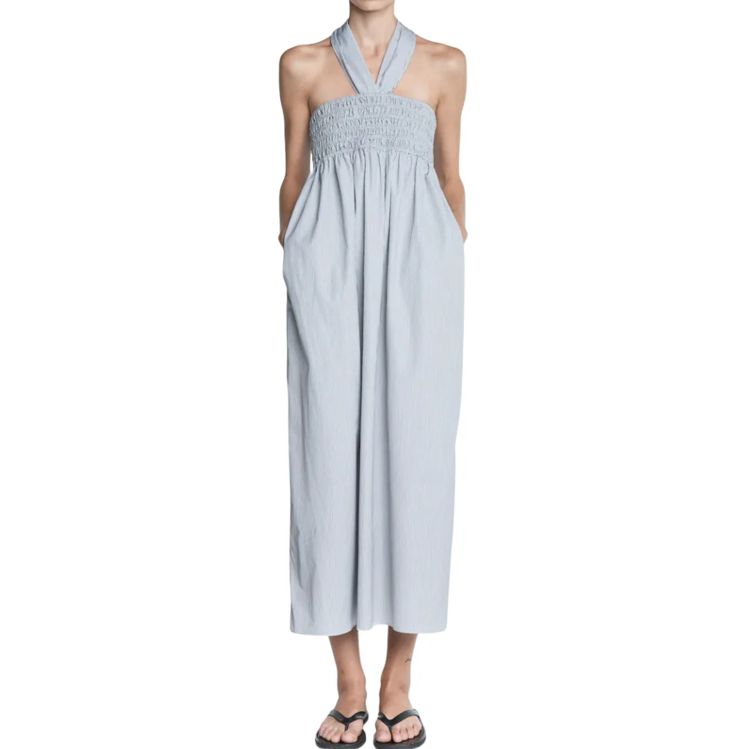 The Empire Halter Dress in pinstripe black and white lightweight GOTS organic cotton has a hand smocked, sateen empire bodice and gently, gathered skirt. The scarf is detachable so the dress can be worn as a halter or strapless. 100% Organic Cotton