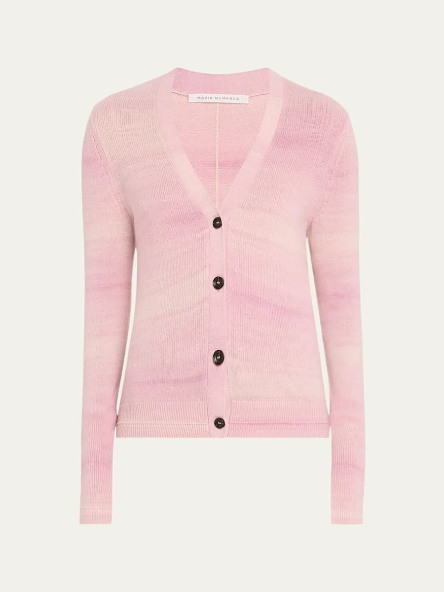 MARIA MCMANUS featherweight knit cardigan in space dye pink V neckline; button front Long sleeves Slit cuffs Fitted Double ribbed cuffs and hem Cashmere/organic cotton Imported Online Inquiries: BGS21_BA4ZC| Store Inquiries: #5037564
