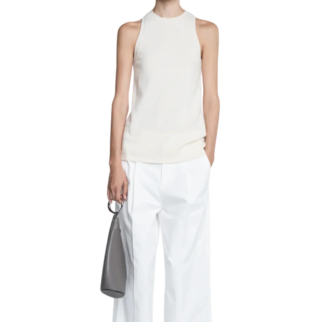 The Lingerie Stitch Racer in ivory is knit from a luxe Italian recycled cashmere and organic cotton blend. It has a slim fit, racer back and a beautiful lingerie stitch detail down the center back. - Ivory - Tank top - 69% Recycled Cashmere 31% GOTS Cotton