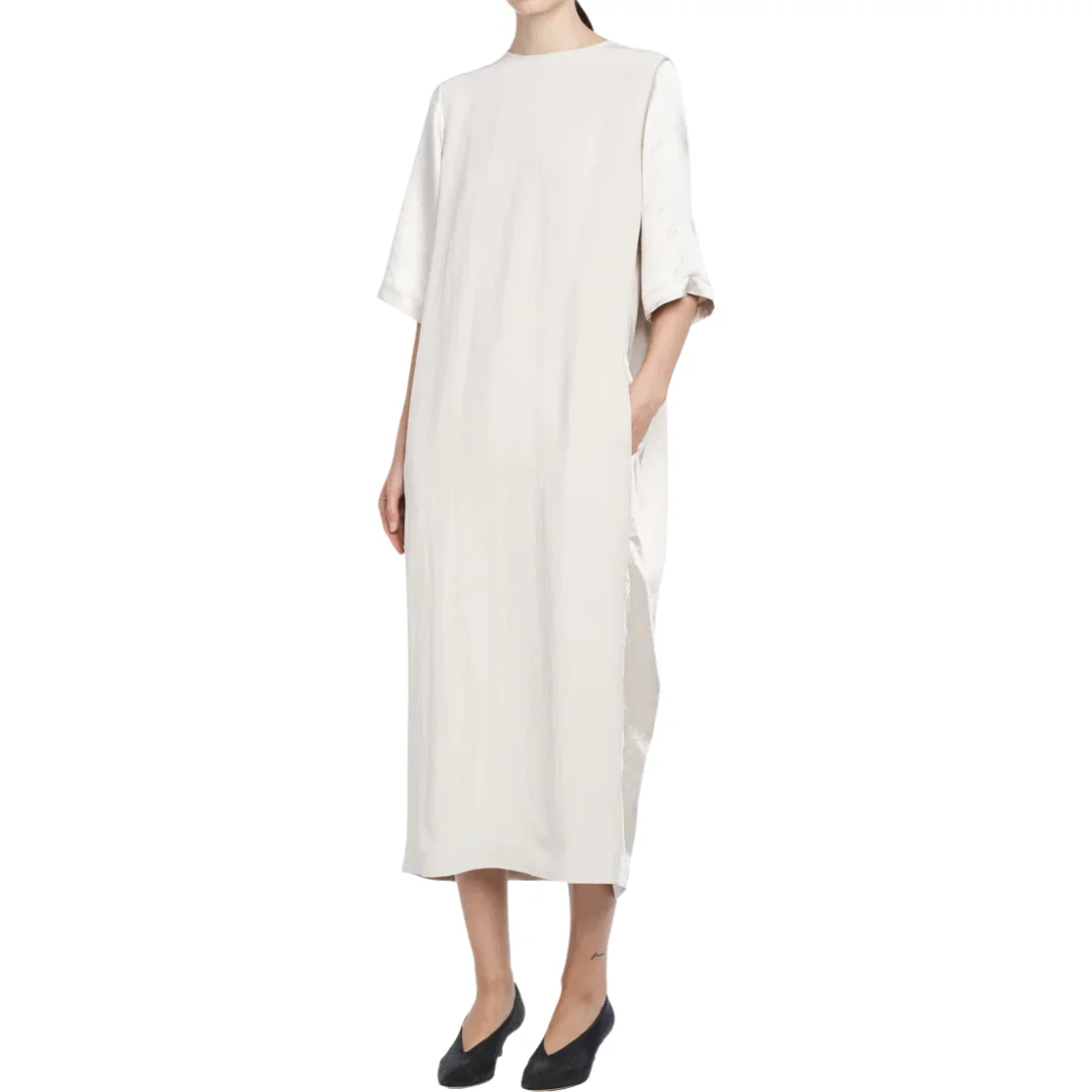 The Midi T-Shirt Dress is locally made from champange Japanese Naia Renw sateen, providing a dynamic look with a matte fronnt and a lustrous back and sleeves. With a loose silhouette, hidden pocketing, and a black close defined by a black ribbon. - Champagne - Midi t-shirt dress - 100% Naia Renew Sateen - Dry clean only - Made in New York