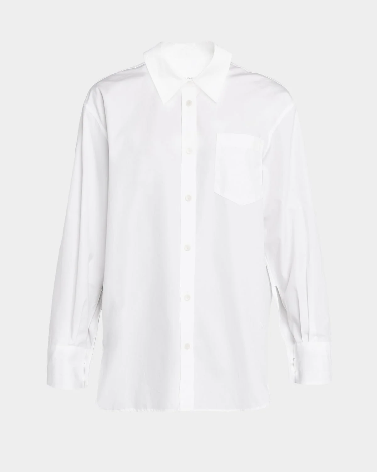 MARIA McMANUS tunicstyle shirt crafted from crisp cotton sateen Point collar Dropped shoulders Long sleeves with button cuffs Chest pocket Oversized fit Rounded hem Buttonfront Organic cotton Machine wash cold Made in Portugal