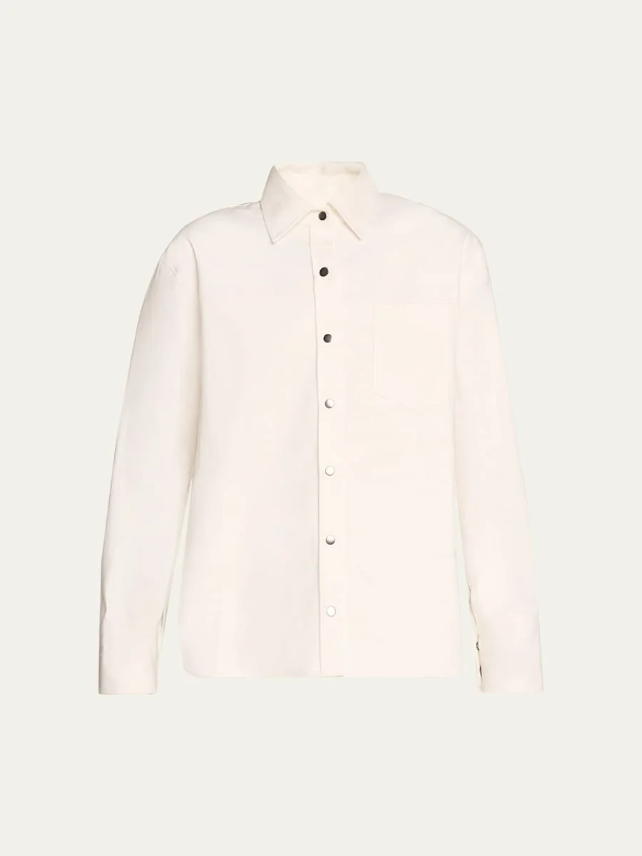 MARIA MCMANUS shirt featuring a chest patch pocket and silvertone snaps Point collar; snap front Long sleeves; snap cuffs Yoked back; box pleat Oversized fit Shirttail hem Organic cotton Made in Portugal Online Inquiries: BGS21_B9UBX| Store Inquiries: #4970119
