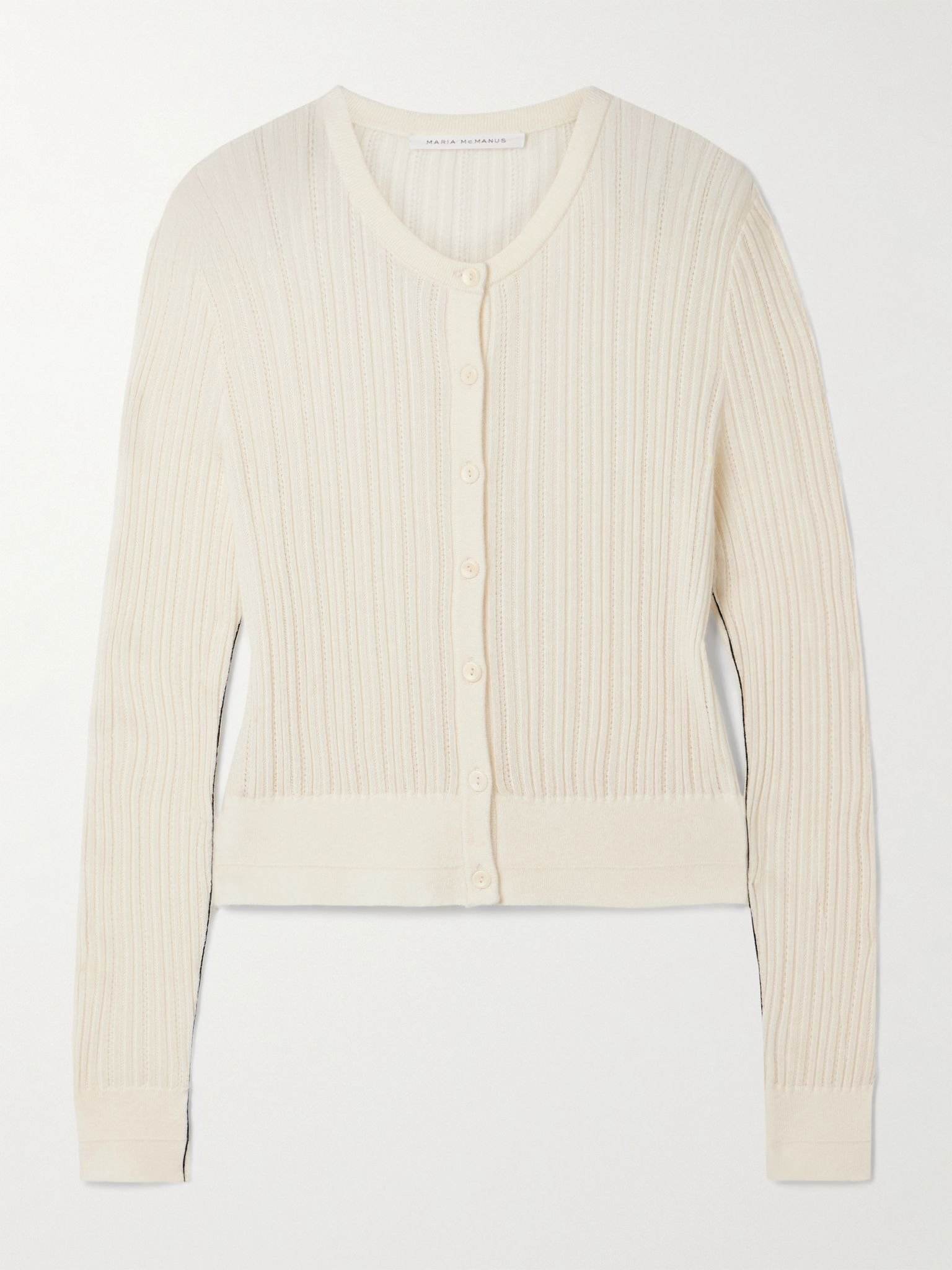 Maria McManus' cardigan is made from exceptionally soft and lightweight merino wool. It has ribbed and pointelle stiches and thin black stripes along the underside of each sleeve. Wear yours solo or layered over a simple tank. Size & Fit - Fits true to size, take your normal size - Cut for a slim fit - Lightweight knit - Model is 180cm/ 5'11" and is wearing a size Small Model measurements: - Bust: 81cm/ 32" - Waist: 61cm/ 24" - Hip: 85cm/ 33.5" Details & Care - Ivory and black merino wool - Button fastenings through front - 100% merino wool