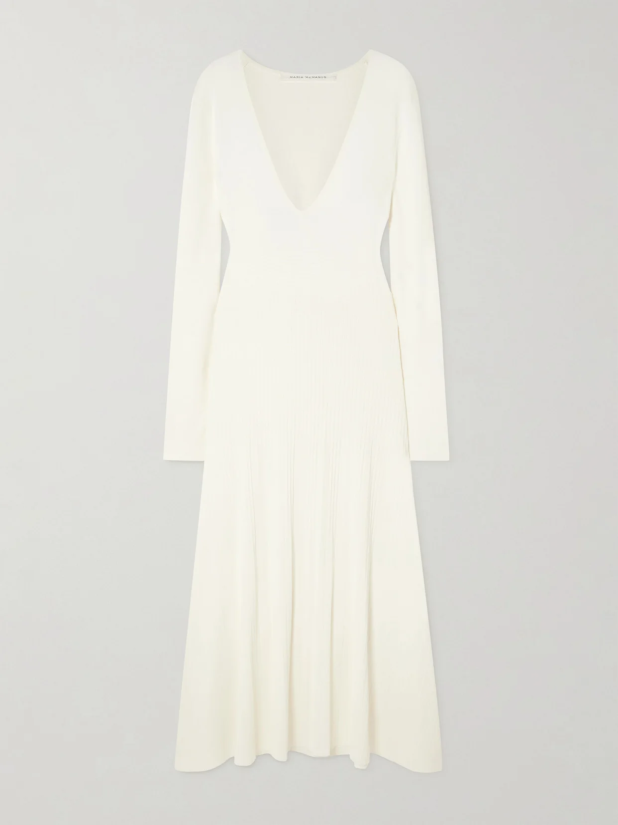 Maria McManus' refined collections are designed to hold a permanent place in your wardrobe. This timeless dress is knitted from certified cellulose with a ribbed finish and fits slim through the bodice before gently flaring out to a floaty hem. Complement the V-neckline with a sparkling pendant. Lower-Impact Materials. This product is made using at least 50% lower-impact materials or ingredients. Find out more about our NET SUSTAIN criteria here.