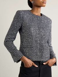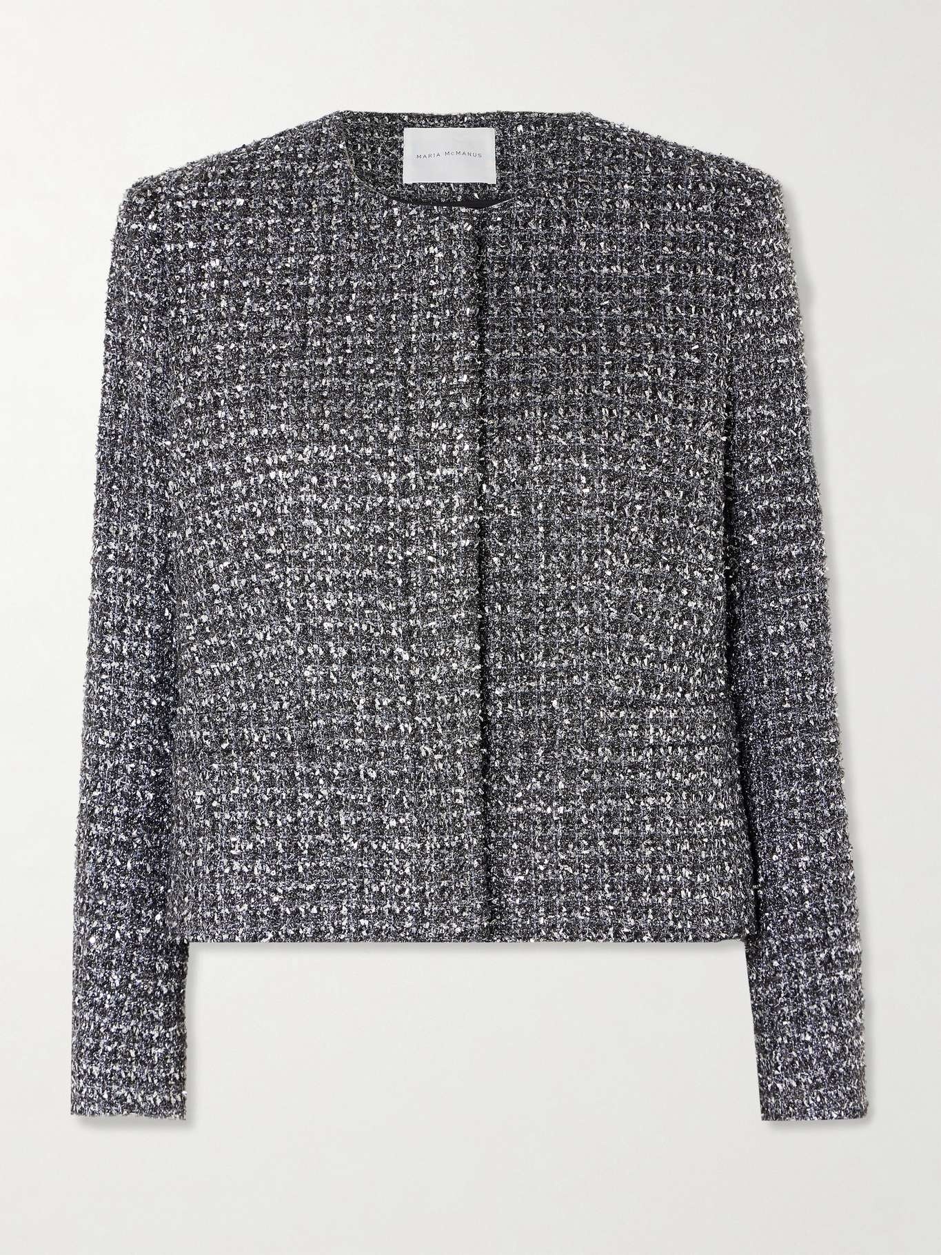 EDITORS'NOTES Maria McManus prides itself on creating heirloom-quality designs, ensuring that the fit and quality of each piece is impeccable. This jacket is tailored from metallic tweed flecked with sequins and has a boxy shape with shoulder pads for structure. SIZE & FIT Model measurements: - Fits true to size, take your normal size - Designed for a slightly loose fit - Internal shoulder pads - Mid-weight, non-stretchy fabric - Model is 180cm/ 5'11" and is wearing a US 2 - Bust: 80cm/ 31.5" - Waist: 65cm/ 25.5" - Hip: 89cm/ 35" DETAILS & CARE - Silver and black tweed - Concealed button fastenings through front - 39% polyamide, 21% metallic polyester, 11% viscose, 10% acrylic, 10% wool, 9% polyester; lining1: 55% cotton, 45% cupro; lining2: 60% cotton, 40% cupro - Dry clean