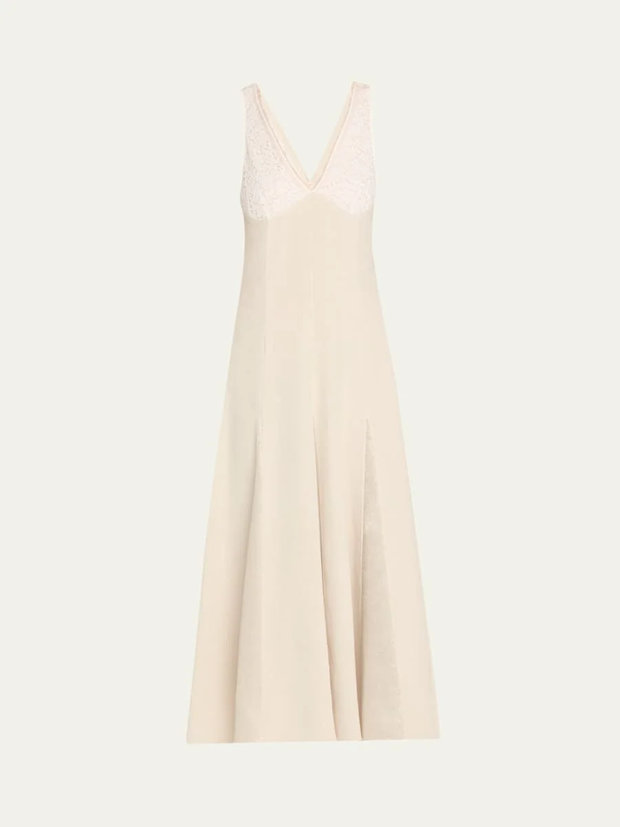 MARIA MCMANUS dress with intricate lace detailing on the bodice features a godet skirt for graceful movement V neckline Sleeveless Hem falls below the knee Fit-and-flare silhouette Back zip Acetate Made in USA from imported materials Online Inquiries: BGS21_B9YLG| Store Inquiries: #5002570