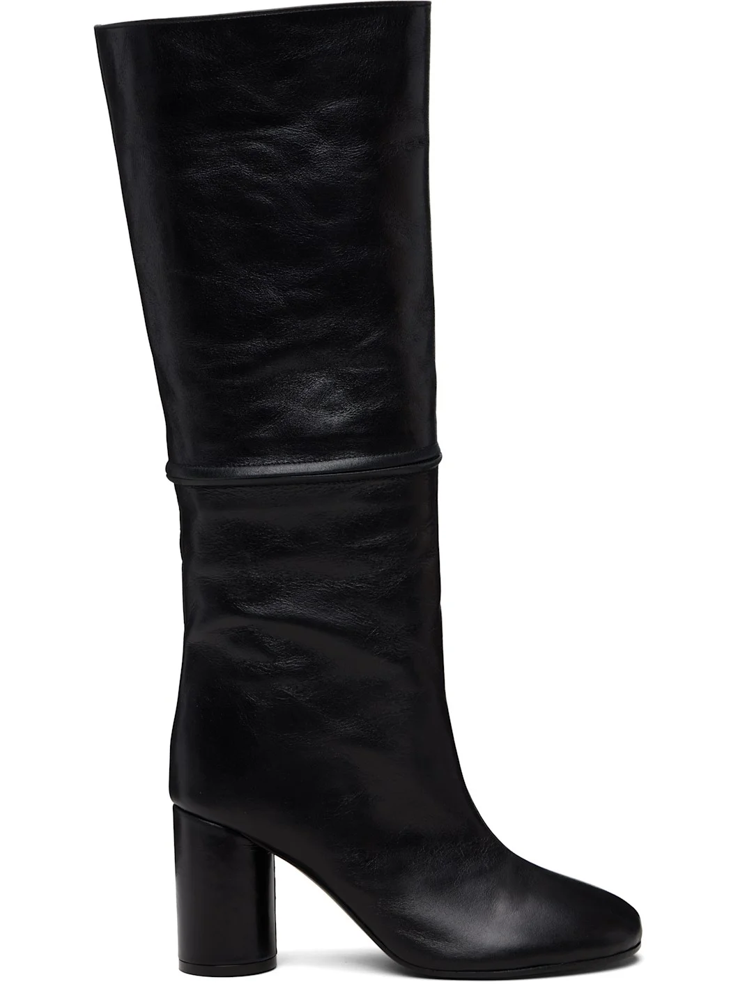 Knee-high crinkled leather boots. · Detachable zip panel for mid-calf styling · Covered cylindrical heel with rubber injection · Leather sole · Heel: H3" Supplier color: Black Leather. Made in Italy 261189F115000
