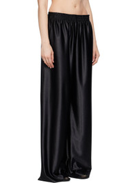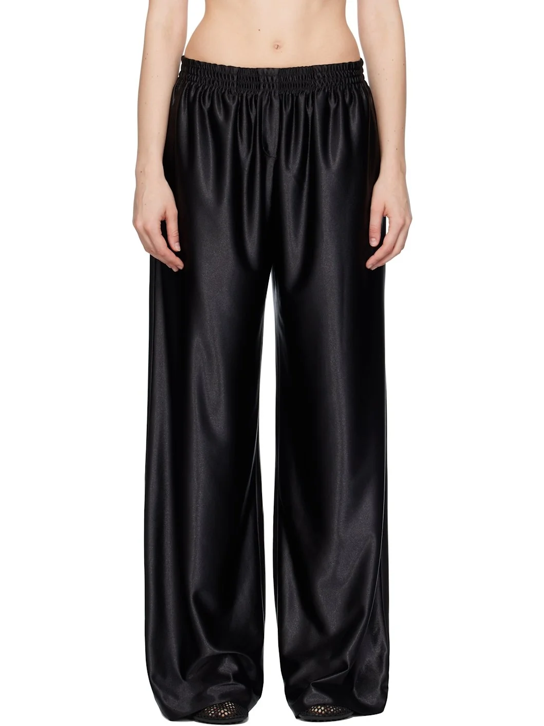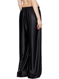 Polyester satin trousers. · Elasticized waistband · Two-pocket styling · Mock fly · Partial plain-woven lining Supplier color: Black Body: 100% polyester. Lining 1: 100% polyester. Lining 2: 100% cotton. Made in Romania 252189F087002