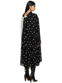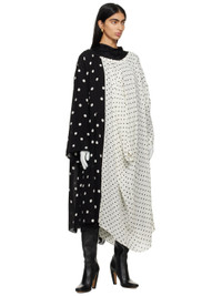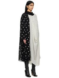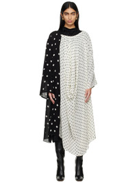 Viscose crepe and silk twill dress. Polka dots throughout. · Asymmetrical, wrap, and layered construction · Self-tie fastening at mock neck · Detachable belt and belt loops at waist · Gathering at waist and shoulders Supplier color: Variable polka dots Body 1: 100% viscose. Body 2: 100% silk. Made in Romania 241808F054006