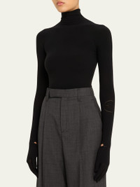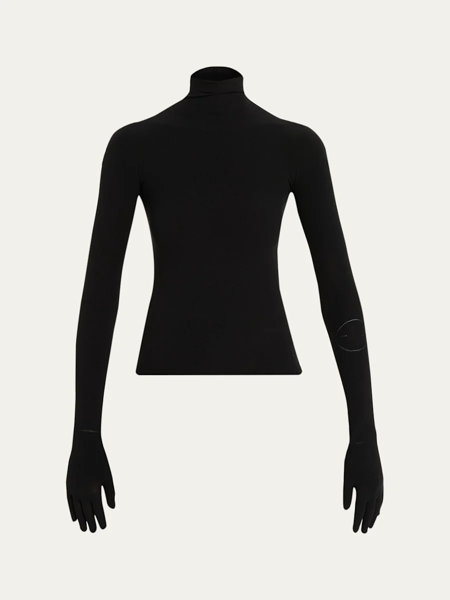 Marie AdamLeenaerdt's "Collant" top features affixed gloves and hand openings for multiwear Turtleneck Long sleeves Slim fit Hip length Pullover style Nylon/polyamide/elastane Unlined Do not iron, machine wash cold Made in Italy