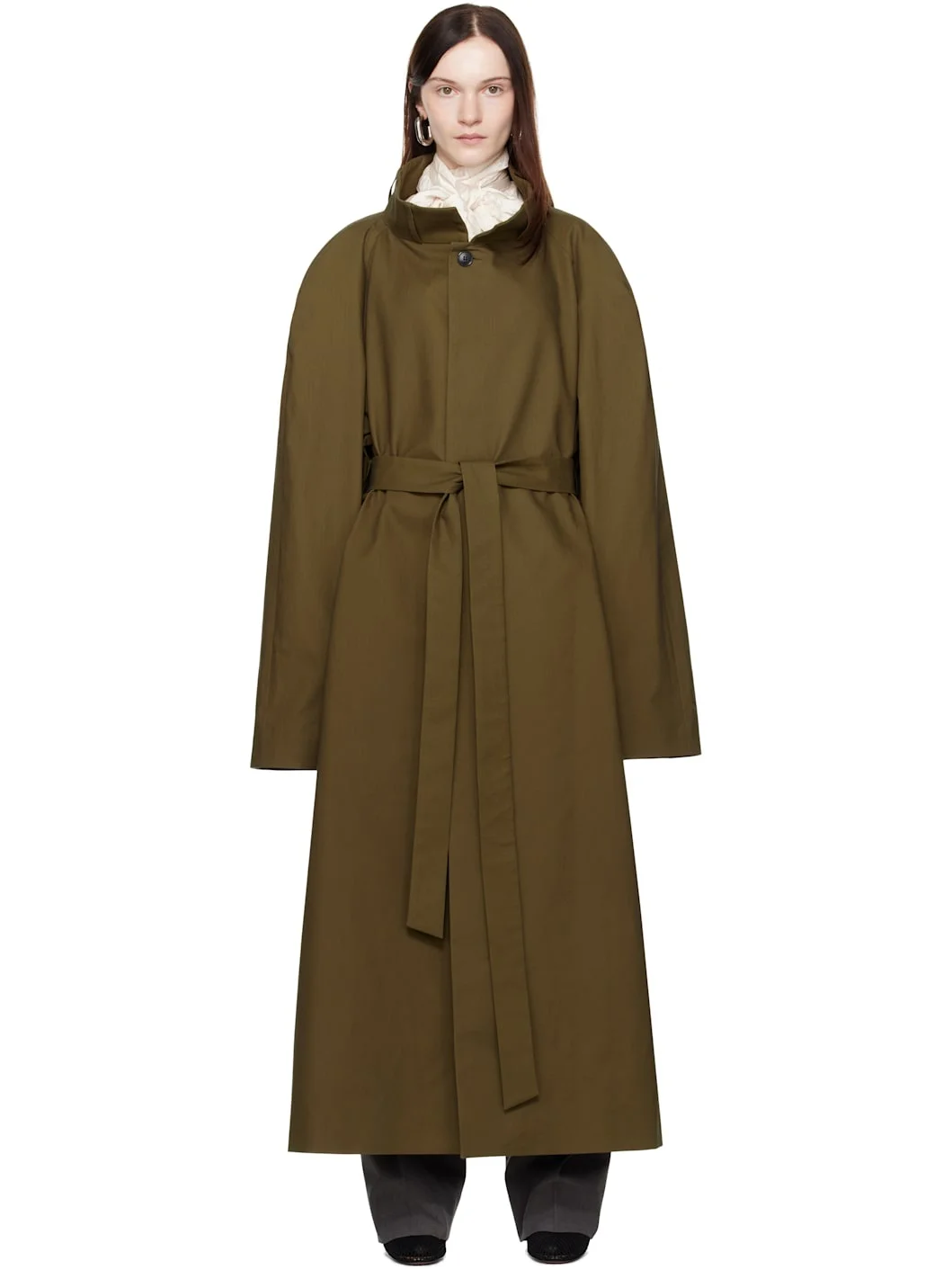 Cotton ripstop trench coat. · Belt loops at funnel neck and waist · Detachable self-tie belt at waist · Concealed button closure · Welt pockets · Storm flap at back · Central vent at back hem · Welt pocket at interior · Full cupro satin lining Supplier color: Khaki Body: 100% cotton. Lining: 100% cupro. Made in Romania 251189F067000