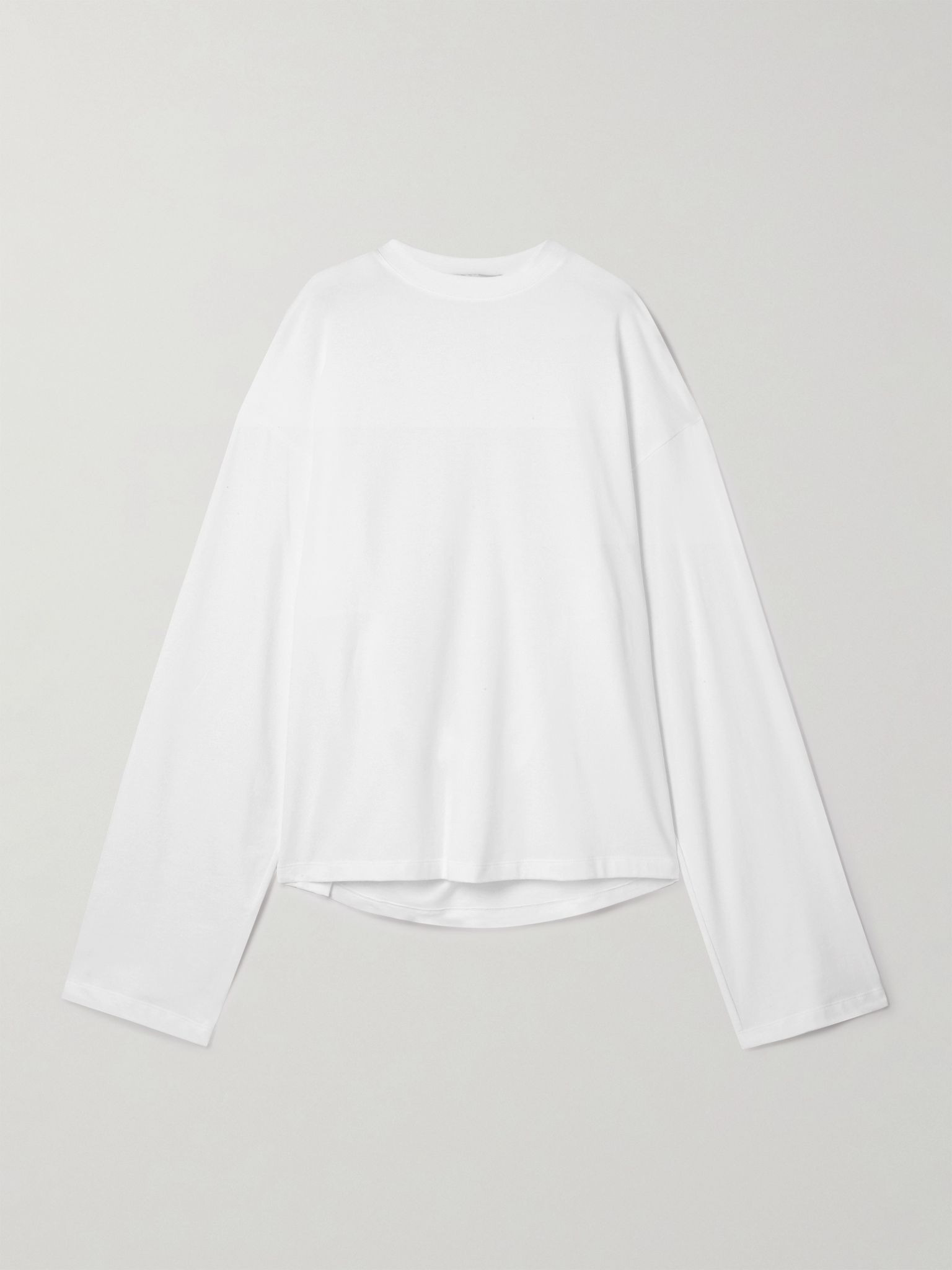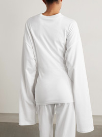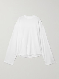 In the hands of Marie Adam-Leenaerdt, even a simple T-shirt feels effortlessly chic. Cut from white cotton-jersey, this version has an oversized fit that's emphasized by elongated sleeves and a slightly asymmetric hem. Tuck yours into the matching wide-leg pants. Size & Fit - Intended to be oversized; we recommend sizing down if you prefer a closer fit - Long in the sleeves - Lightweight, slightly stretchy fabric - Model is 180cm/ 5'11" and is wearing a FR 36 Model measurements: - Bust: 81cm/ 32" - Waist: 61cm/ 24" - Hip: 85cm/ 33.5" Details & Care - White cotton-jersey - Slips on - 100% cotton - Machine wash