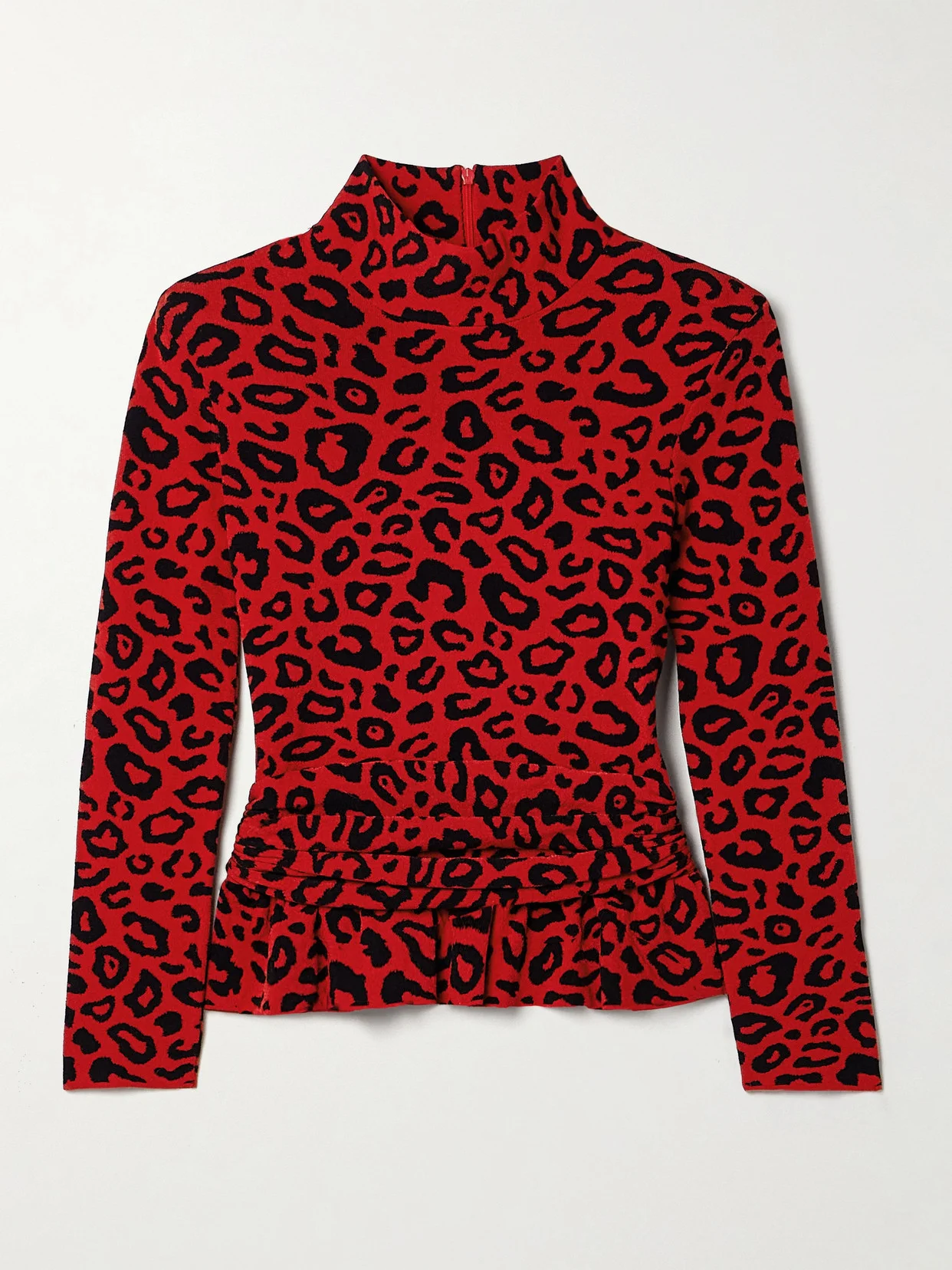 Jacquard-knitted with bold leopard spots, Marie Adam-Leenaerdt's top appeared as one of a few pops of color seen on the Fall '24 runway. It has a classic turtleneck and subtle ruching at the waist that highlights the subtle ruffled peplum hem. Take cues from the brand and style yours with a midi skirt and boots.