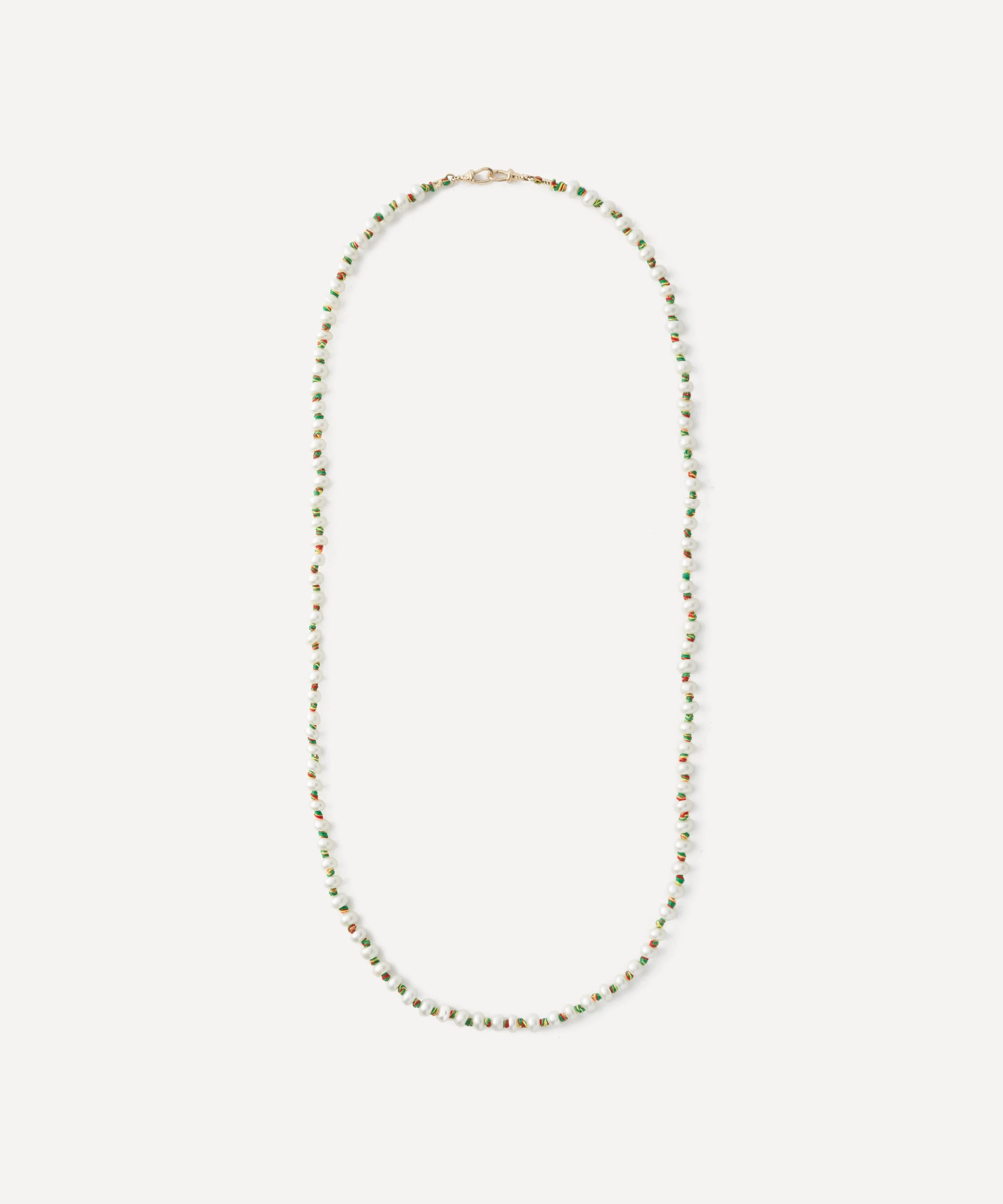 DETAILS Pearl necklace 9ct gold Freshwater pearls Green, yellow and red mauli link detailing Signature Handcuff clasp fastening Handmade in India COMPOSITION & SIZE 9ct Gold; Freshwater Pearl; Mauli Silk L: 37cm
