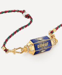 DETAILS Locket necklace 18ct gold Double loop Mauli cord Blue enamel Heart-cut diamonds Round diamond accents Freshwater pearls Finley chiselled finish Inscription: ”Amour Toujours” Handcuff finish at each end COMPOSITION & SIZE 18ct Gold; 1.02ct Diamonds; Enamel; Freshwater Pearls; Mauli Silk Chain L: 73cm