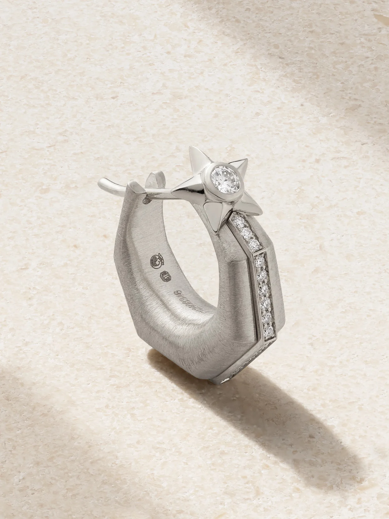 Marie Lichtenberg's 'Baba' earring is handmade from 18-karat white gold with microscopic etchings that create a brushed finish. It's designed in an angular hoop shape that's traced with a row of diamonds and topped with another in a star-shaped setting.