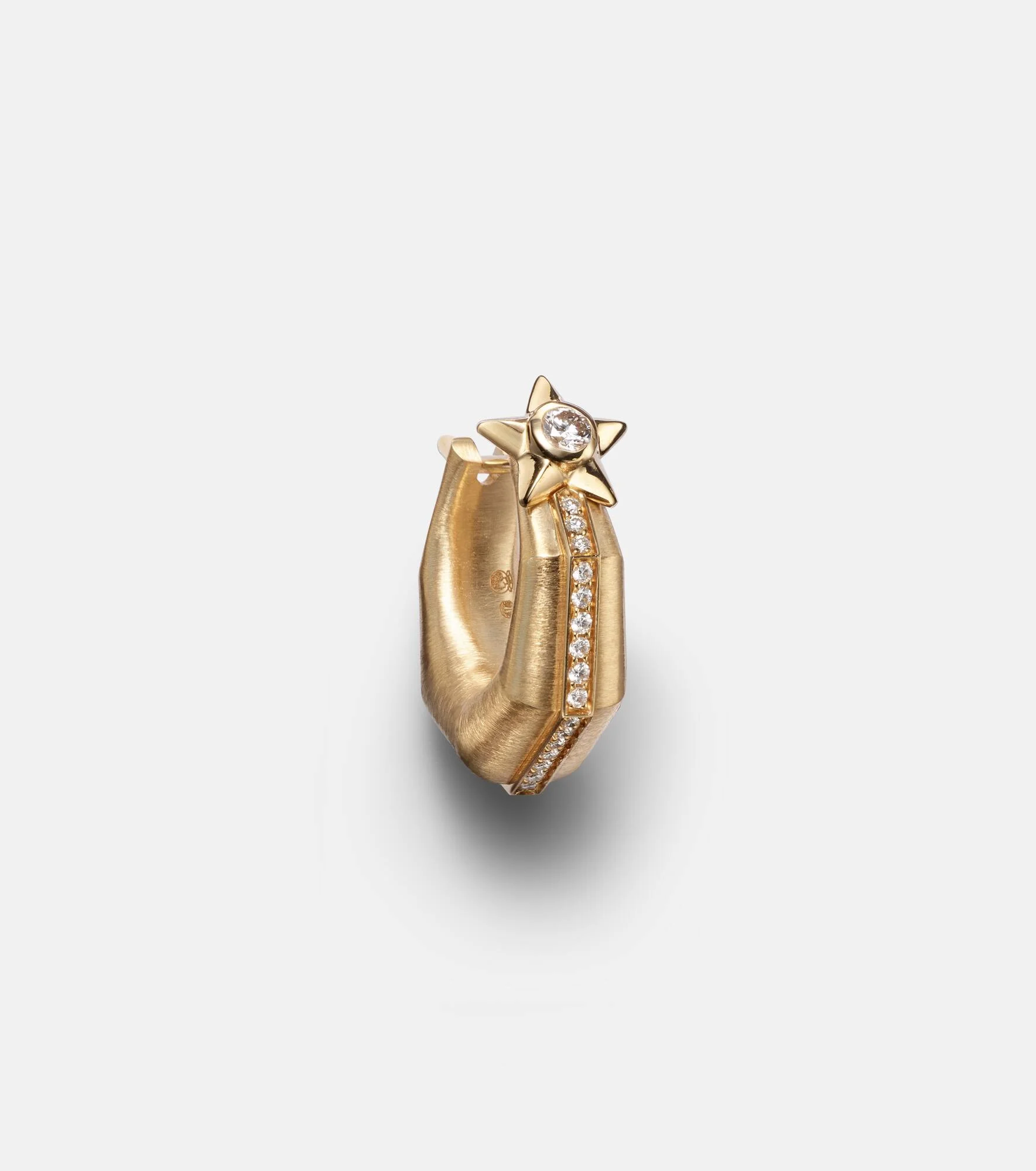 Inspiring and eye-catching, Marie Lichtenberg's pieces are made to be worn time and again. The Baba Small hoop earring is meticulously crafted from 18kt yellow gold and showcases a distinctive, angular silhouette. It's encrusted with 32 white diamonds in a pave and bezel setting. Product Details - Material: 18kt yellow gold (750/1000) - Made in Italy - Stone I: 32 diamonds, round-cut, pave setting, bezel setting, VS clarity grade, VS clarity grade, G color grade, G color grade - Color: gold - Carat total weight (ctw): 0.12, 0.12 - Closure: safety latch - For pierced ears - Item number: P01014979 Size & Fit - Length 15mm-0.6" - Max. width 6mm-0.25" - Inner diameter 11mm-0.45"