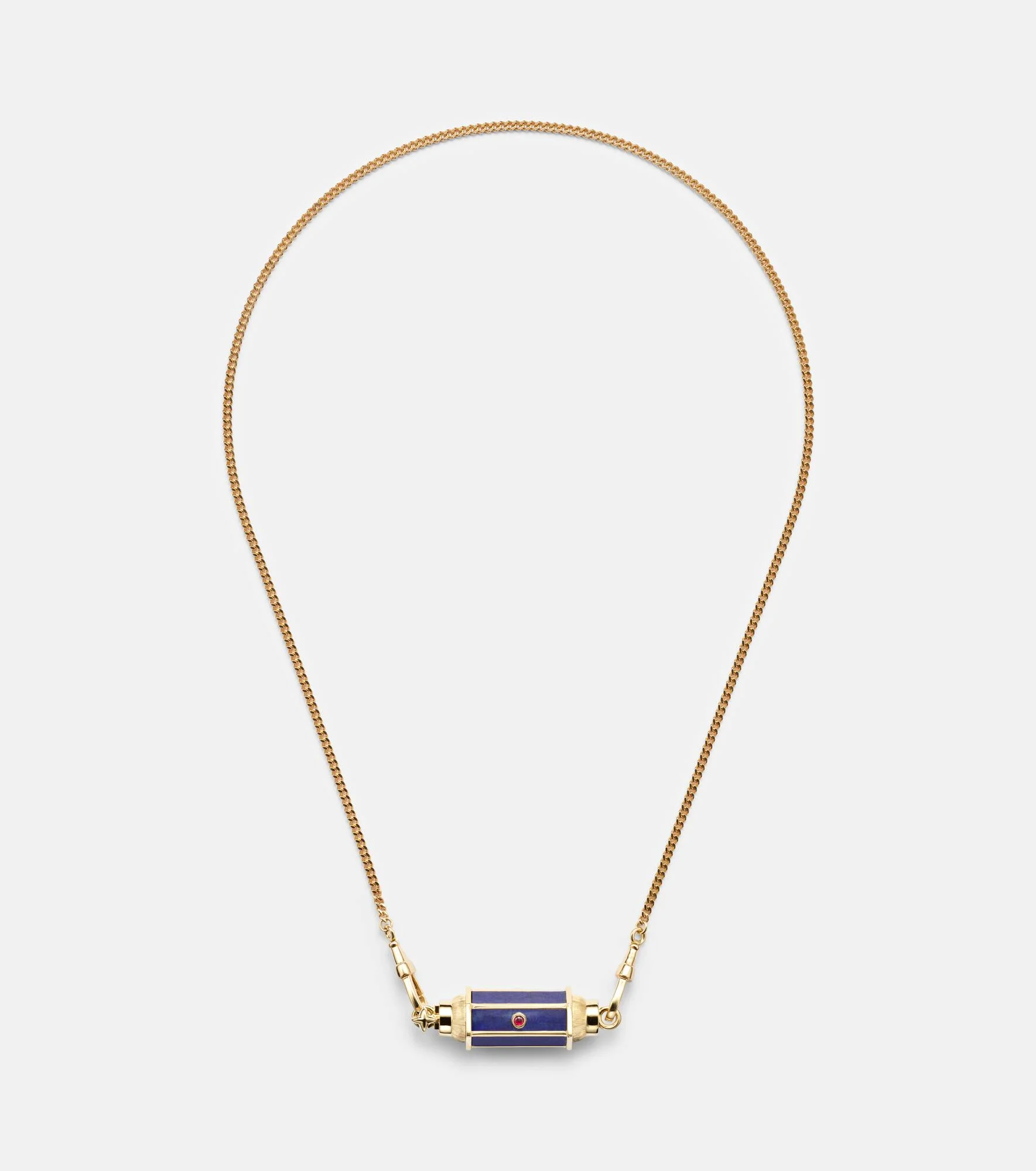 Timeless value and emotional significance lay the groundwork for every Marie Lichtenberg creation. The Baby 18kt yellow gold pendant necklace features a refined locket enriched with lapis inlays and suspended from the brand's signature gourmette chain. Showcasing unmatched artistry, the style is complete with three exquisite rubies for a sophisticated finish. Product Details - Material: 18kt yellow gold (750/1000) - Made in Italy - Item color: gold - Color: gold - Stone I: lapis lazuli - Stone II: ruby, 0.11ct, round-cut, bezel setting - Closure: lobster-clasp fastening - Item number: P01118643 Size & Fit - Length when open 40cm-15.5" - Width 1mm-0.05" - Pendant length 11mm-0.45" - Pendant width 34mm-1.35"