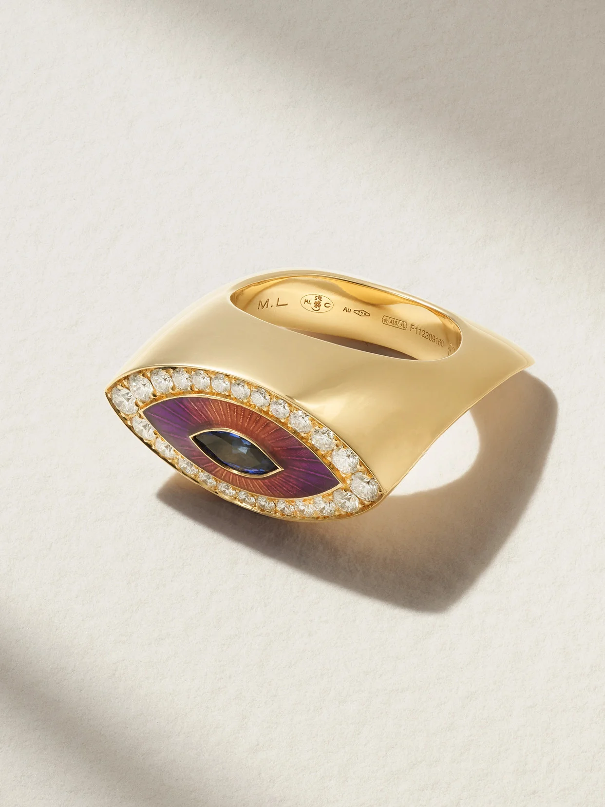 Marie Lichtenberg's ring depicts an 'Evil Eye' talisman, widely believed to ward off negative energy. Handcrafted from 18-karat gold, it's centered by a color-rich sapphire and framed with light-catching diamonds. It's destined to become a treasured addition to your collection.