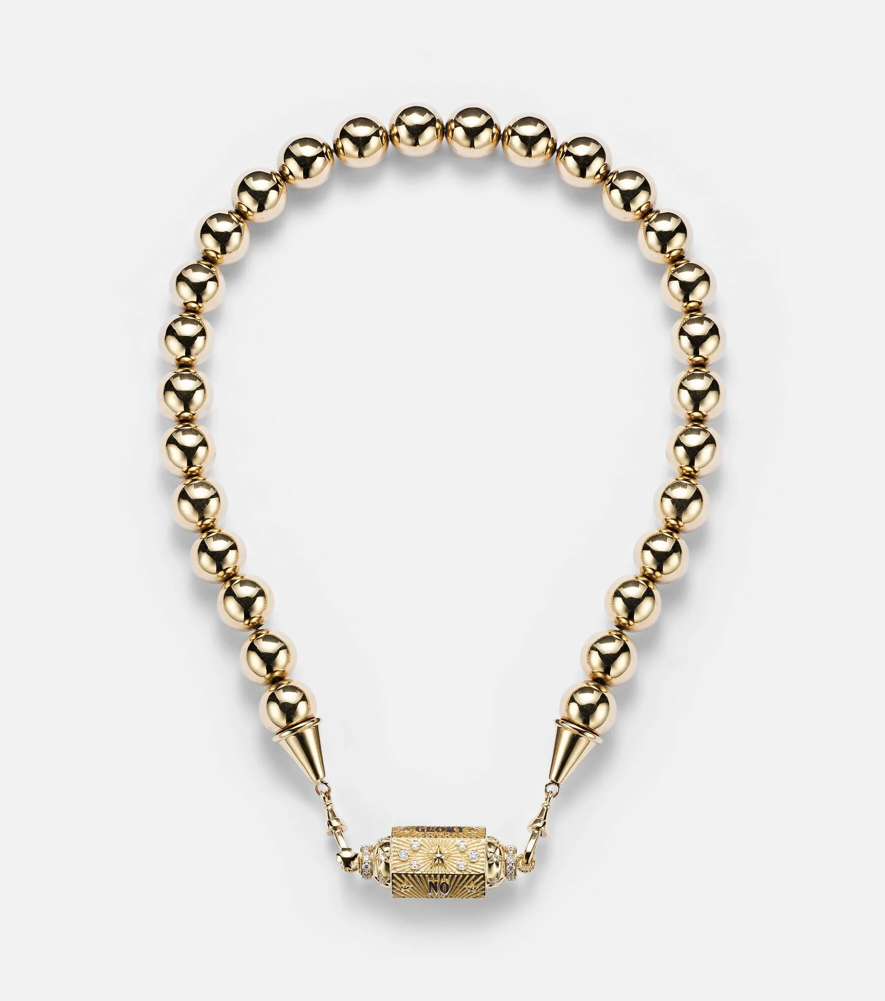 Embrace fearlessness with the No Risk No Glory locket necklace by Marie Lichtenberg. Crafted from 18K gold, the iconic locket is adorned with 48 diamonds totaling 0.77ctw. Suspended from a Silky Mauli link, the design features the brand's signature handcuff clasps, making the pendant removable for versatile styling. Product Details - Material: 18kt yellow gold (750/1000) - Made in Italy - Item color: gold - Color: gold - Stone I: 48 diamonds, 0.77ctw, round-cut, flush setting, pave setting, SI1 clarity grade, G color grade - This piece features natural diamonds only - Item number: P00986330 Size & Fit - Length when open 39cm-15.5" - Width 11mm-0.45" - Pendant length 15mm-0.6" - Pendant width 38mm-1.5"