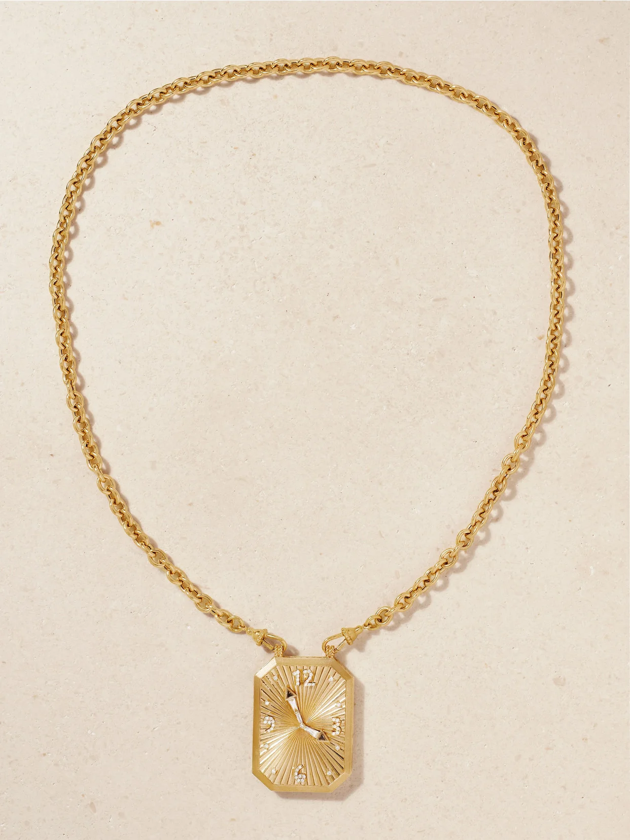 Marie Lichtenberg is known for its symbolic and sentimental designs. Handmade from 18-karat gold and sprinkled with diamonds, the front of this necklace displays a clock, while the reverse is inscribed with the phrase 'Thinking of You All the Time'. The pendant dangles from one of the label's signature 'Rosa' chains, and can be detached, so you can mix and match.