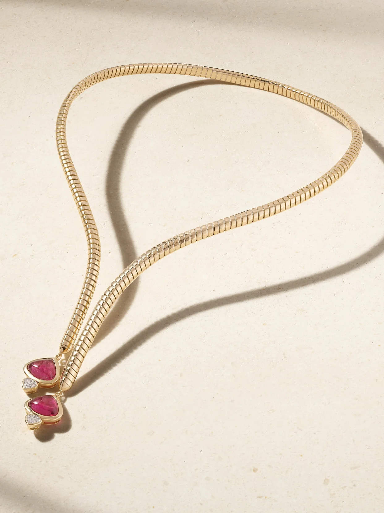 Marina B's necklace is crafted from 18-karat gold with a flexible 'Tuboga' chain that traces the natural curves of your decolletage. Honoring the designer's signature 'Trisola' styles, each end is finished with a rubellite in a curved, triangular shape that highlights the stones' natural vibrancy. The dangling diamond charms add extra sparkle.